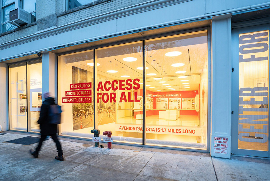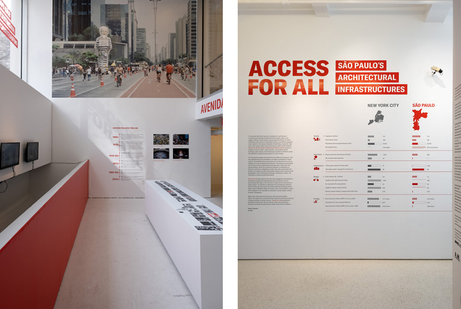 Diseño gráfico del montaje de la exposición "Access For All, Sao Paulo´s Social Infrastructures" en el Center for Architecture, Nueva York. Curador: Daniel Talesnik. Arquitectura: Mariana Vilela. Fotografías de la exhibición: Pedro Kok